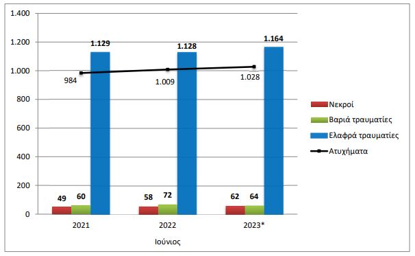 Σύμφωνα με τους συντάκτες της έκθεσης, τα οδικά τροχαία ατυχήματα, που συνέβησαν σε ολόκληρη τη Χώρα και προκάλεσαν τοv θάνατο ή τον τραυματισμό ατόμων, αυξήθηκαν κατά 1,9% σε σύγκριση με τον αντίστοιχο μήνα του 2022 (1.028 τον Ιούνιο του 2023, έναντι 1.009 τον Ιούνιο του 2022).