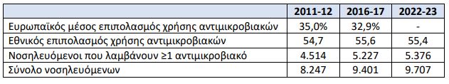 Όπως φαίνεται στον πίνακα που ακολουθεί, ο ευρωπαϊκός μέσος όρος χρήσης αντιμικροβιακών φαρμάκων είναι 32,9%, με τον ελληνικό να βρίσκεται στο 55,4%.