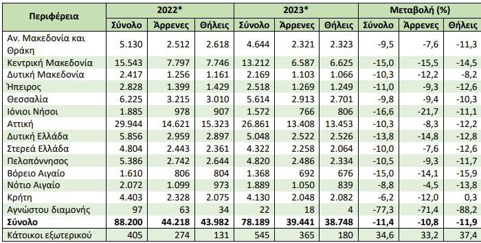 Τα αντίστοιχα ποσοστά μεταβολής, ανά έτος, για την περίοδο 2017 - 2022 ανέρχονται σε 5,1% το 2022 σε σχέση με το 2021 (83.955), 9,7% το 2021 σε σχέση με το 2020 (76.549), -0,5% το 2020 σε σχέση με το 2019 (76.950), 7,0% το 2019 σε σχέση με το 2018 (71.919) και -6,9% το 2018 σε σχέση με το 2017 (77.256).