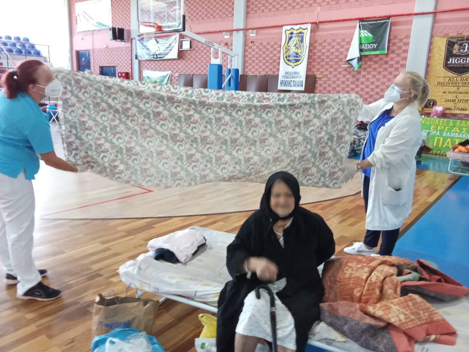 "Βρίσκονται σε ένα από τα δωμάτια, την αίθουσα των βαρών του Γυμναστηρίου. Είναι ακόμη τα βάρη μέσα, υπάρχουν στοίβες από εμφιαλωμένα νερά και ρούχα, και ανάμεσα σε αυτά έχει στηθεί ένα εξεταστικό κρεβάτι", λέει, περιγράφοντας την εικόνα, και προσθέτει: "Ο χώρος είναι προφανώς ακατάλληλος. Οι συνάδελφοι μπορούν μόνο να ξαπλώσουν έναν ασθενή στο εξεταστικό κρεβάτι και να τον ακούσουν με το στηθοσκόπιο. Ούτε καρδιογράφο δεν είχε, ήρθε μετά με κάποια δωρεά". Στην κυρίως αίθουσα του γυμναστηρίου φιλοξενούνται σήμερα 40 πλημμυροπαθείς, έναντι 80 την περασμένη εβδομάδα, ενώ έξω απ’ αυτό υπάρχουν δύο κινητές μονάδες που έστειλε η 5η ΥΠΕ, οι οποίες σύμφωνα με τον πρόεδρο των γιατρών δεν έχουν εξεταστήριο.