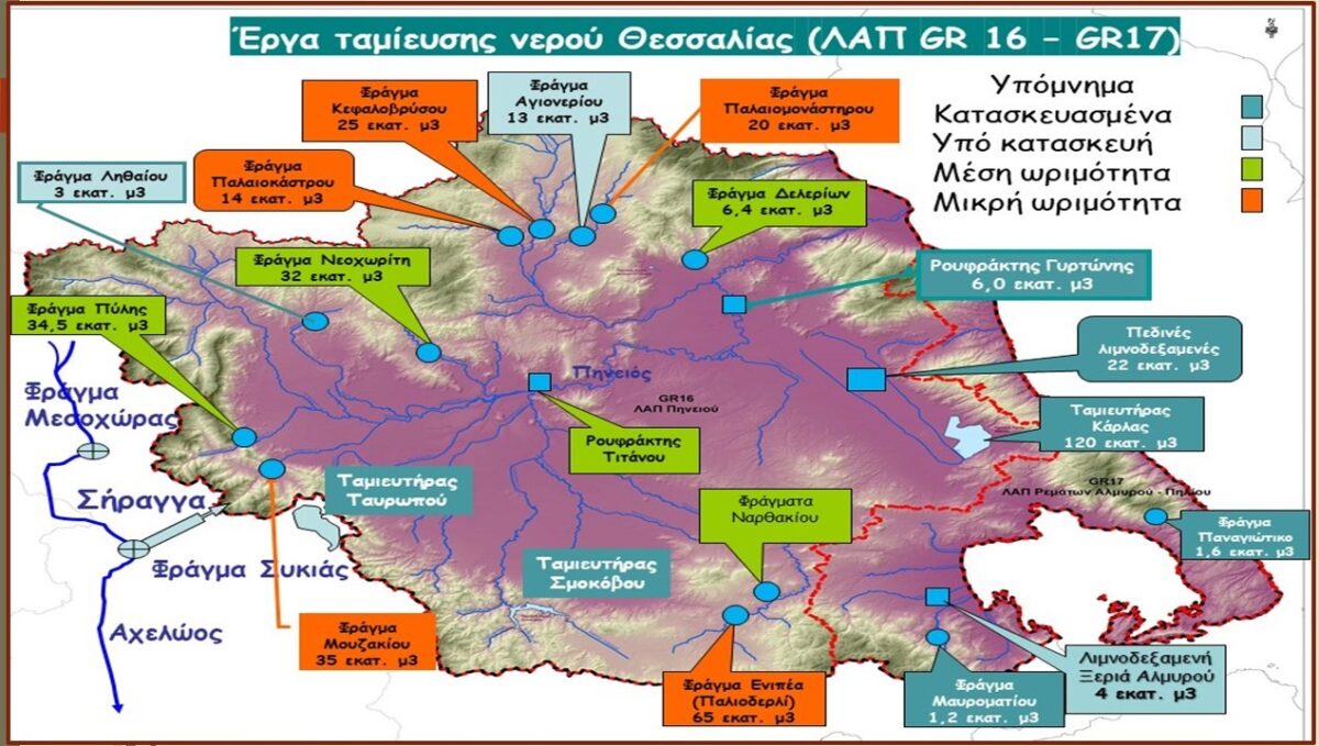 Οι ταμιευτήρες νερού περιμετρικά της Θεσσαλίας (Σκοπιά Φαρσάλων, περιοχή Ελασσόνας, Νεοχώρι, Πύλη Τρικάλων, Μουζάκι) που θα συγκρατούν τα νερά στα ορεινά κατά την διάρκεια των πλημμυρών, προβλέπονται στα εγκεκριμένα Σχέδια Διαχείρισης Λεκάνης Απορροής Ποταμών του 2014 και στην αναθεώρησή τους το 2017, με συνολικό όγκο υδάτων 150 εκατομμυρίων κ.μ. νερού.