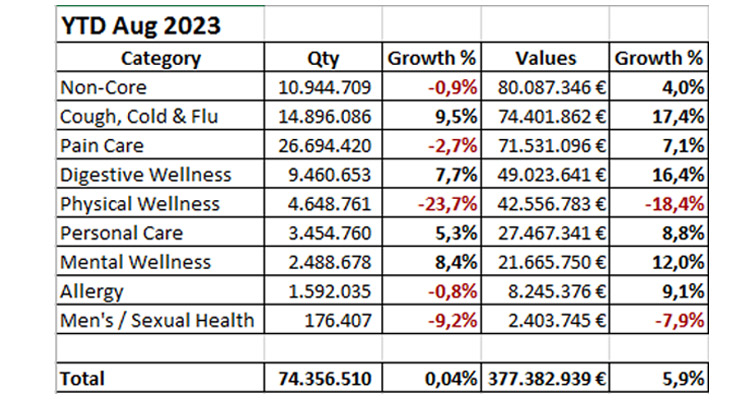 Ετσι, σύμφωνα πάντα με τα στοιχεία του πίνακα, τη μεγαλύτερη αύξηση εσόδων κατά 17,4% αλλά και τεμαχίων κατά 9,5% είχε η θεραπευτική κατηγορία των φαρμάκων για τον βήχα. Ακολουθούν τα σκευάσματα για το πεπτικό με την αύξηση στις πωλήσεις να είναι 16,4% το οκτάμηνο και 7,7% στα πωληθέντα τεμάχια. Στην τρίτη θέση βρίσκονται τα σκευάσματα για το άγχος και τον ύπνο, με την αύξηση στις πωλήσεις να είναι 12%, ενώ άνοδο κατά 8,4% είχαν τα τεμάχια που αγοράστηκαν από τους πελάτες των φαρμακείων. Με θετικό πρόσημο έκλεισε το οκτάμηνο και η κατηγορία των ειδών προσωπικής υγιεινής.
