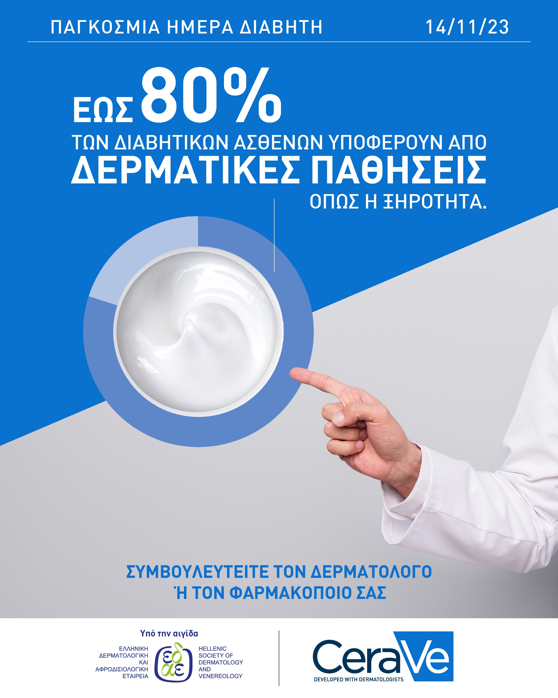 Να ενημερωθούμε, σε αρχικό στάδιο. Ένας τρόπος για να το κάνουμε αυτό είναι η νέα εκστρατεία της CeraVe υπό την αιγίδα της Ελληνικής Δερματολογικής και Αφροδισιολογικής Εταιρείας, με τίτλο "Φροντίζοντας το δέρμα των ασθενών με σακχαρώδη διαβήτη". Σκοπός της εκστρατείας είναι η ευαισθητοποίηση και η ενημέρωση γύρω από τις δερματικές παθήσεις που μπορεί να προκληθούν από τον διαβήτη. Αν πάσχετε από διαβήτη, μιλήστε με τον γιατρό σας για τις πιθανές δερματικές επιπλοκές που μπορεί να εμφανίσει η πάθησή σας και μην αφήσετε τον εαυτό σας να βρεθεί προ εκπλήξεως.