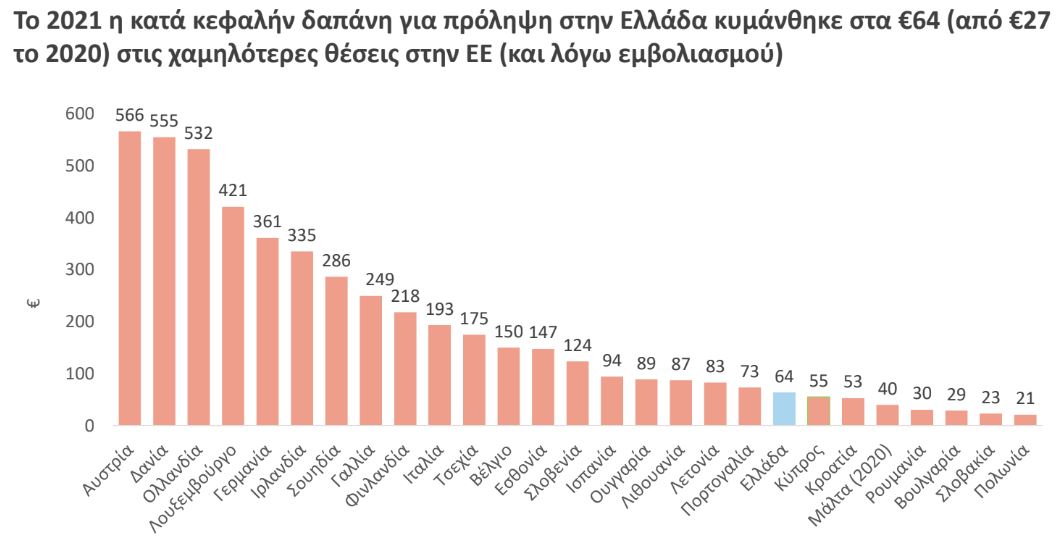 Όπως φαίνεται στον πίνακα, η δαπάνη το 2021 ήταν μόλις 64 ευρώ ανά Έλληνα, ποσό που κατατάσσει τη χώρα μας σε μία από τις χειρότερες θέσεις.