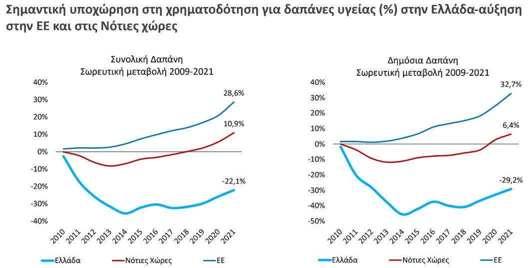 Από την ίδια μελέτη προκύπτει, επίσης, σημαντική υποχώρηση στις δαπάνες Υγείας στην Ελλάδα, την ώρα που καταγράφηκε αύξηση στις άλλες ευρωπαϊκές χώρες και στις Νότιες χώρες.