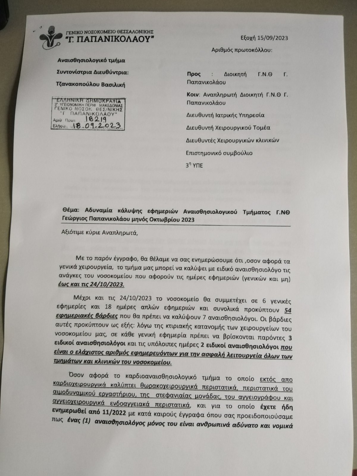 Όπως αναφέρει, έμειναν 7 αναισθησιολόγοι από 20 που εργαζόνταν, την ώρα που το νοσοκομείο έχει 27 συνολικά οργανικές θέσεις.