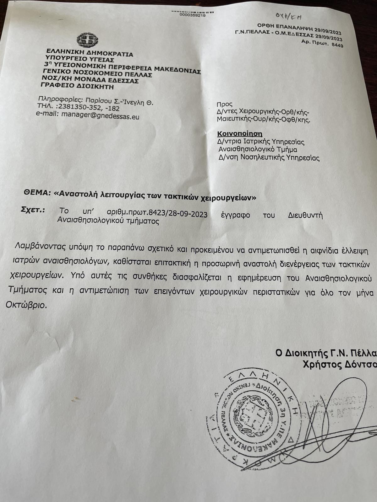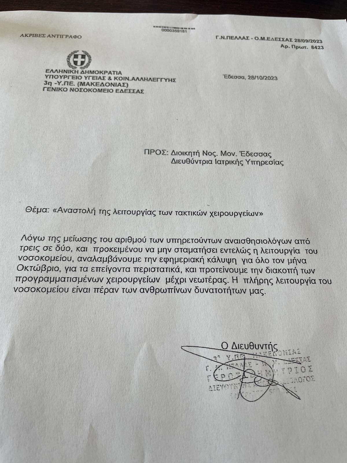 Αναστολή τακτικών χειρουργείων - αναφέρει - έχει γίνει στο νοσοκομείο Έδεσσας, όπου έμειναν 2 αναισθησιολόγοι από τους 4.