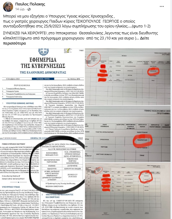 Ο Π. Πολάκης επισυνάπτει στην ανάρτησή του, από τη μια μεριά το ΦΕΚ της συνταξιοδότησης του χειρουργού Παίδων, στις 25/9/2023, λόγω συμπλήρωσης ορίου ηλικίας και από την άλλη το πρόγραμμα χειρουργείου στις 23 και στις 27 Οκτωβρίου που εξακολουθεί να εμφανίζει το όνομά του, υπό την ιδιότητα του διευθυντή της Παιδοχειρουργικής Κλινικής.