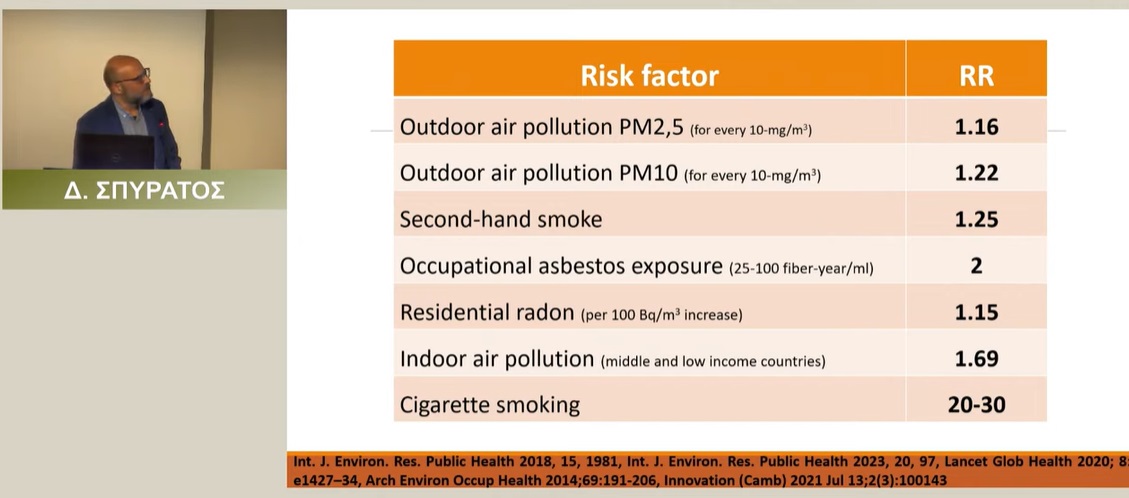 Στην ίδια εκδήλωση, ο αναπληρωτής καθηγητής Πνευμονολογίας, Διονύσιος Σπυράτος, παρουσίασε τα τελευταία δεδομένα αναφορικά με τρεις άλλους, μη αμελητέους, παράγοντες κινδύνου για την ανάπτυξη καρκίνου του πνεύμονα, με σημαντικότερη την ατμοσφαιρική ρύπανση.