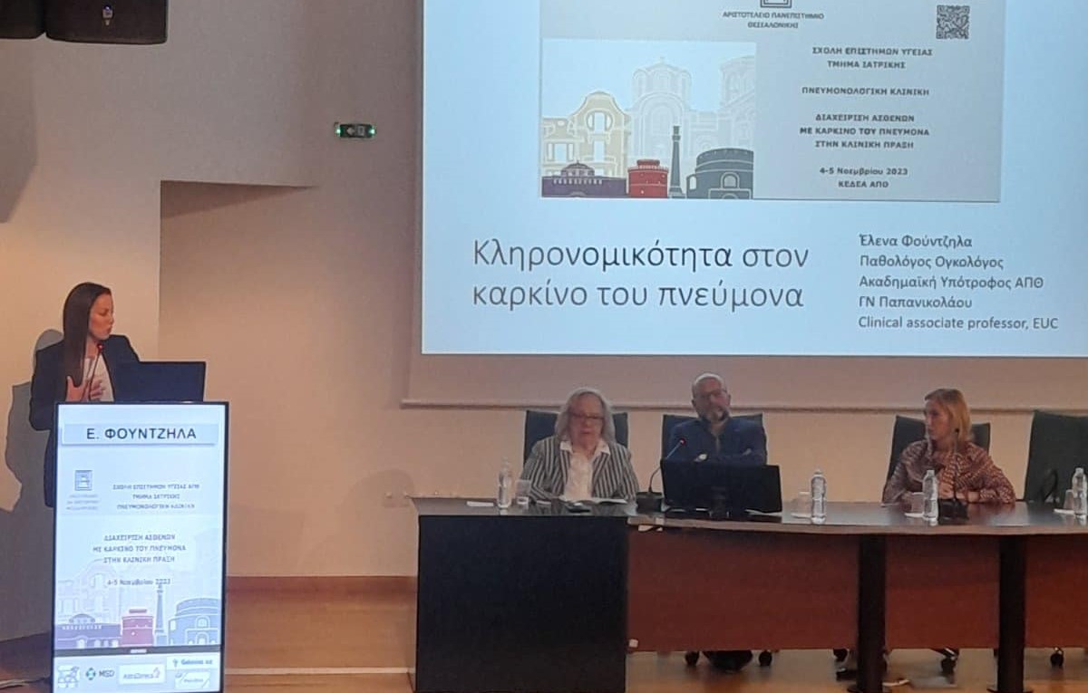Η παθολόγος – ογκολόγος, πανεπιστημιακή υπότροφος του ΑΠΘ στην Πνευμονολογική Κλινική ΑΠΘ του νοσοκομείου "Γ.Παπανικολάου", Έλενα Φούντζηλα (φωτογραφία), ανέλυσε τα τελευταία δεδομένα στη διάρκεια διήμερης επιστημονικής εκδήλωσης της Κλινικής με θέμα τη διαχείριση ασθενών με καρκίνο του πνεύμονα στην κλινική πράξη.