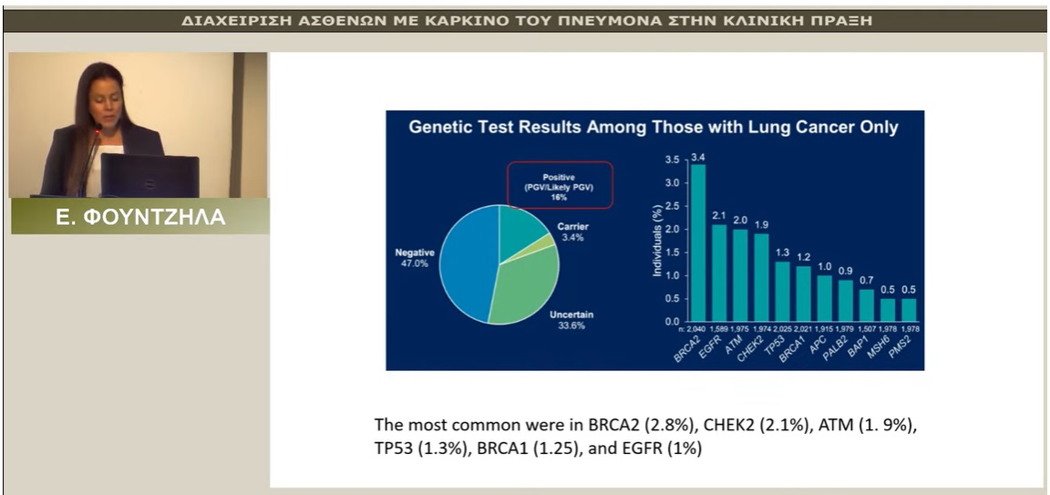 "Τα τελευταία χρόνια, γνωρίζαμε ότι υπάρχουν σε ένα πολύ μικρό ποσοστό κληρονομούμενες μεταλλάξεις σε ασθενείς με καρκίνο πνεύμονα. Αυτές αφορούσαν δύο κυρίως γονίδια, τον EGFR και το Ρ53", ανέφερε η κ.Φούντζηλα, προσθέτοντας πως στον ΕGFR αυτές οι μεταλλάξεις αφορούν περίπου το 0,5% με 1% των ασθενών με καρκίνο πνεύμονα. Μια συγκεκριμένη μετάλλαξη, η EGFR T790M, εμφανίζεται σε ασθενείς που έχουν λάβει κάποιον αναστολέα EGFR πρώτης - δεύτερης γενιάς.