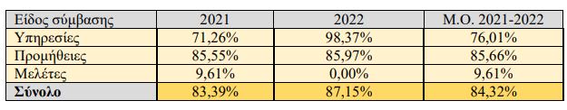 Εάν συνυπολογισθούν και οι συμβάσεις ήσσονος αξίας το ποσοστό των απευθείας αναθέσεων επί του συνόλου των αναθέσεων κυμάνθηκε από 41,91% έως 96,85% με τον μέσο όρο να ανέρχεται σε 87,88%.