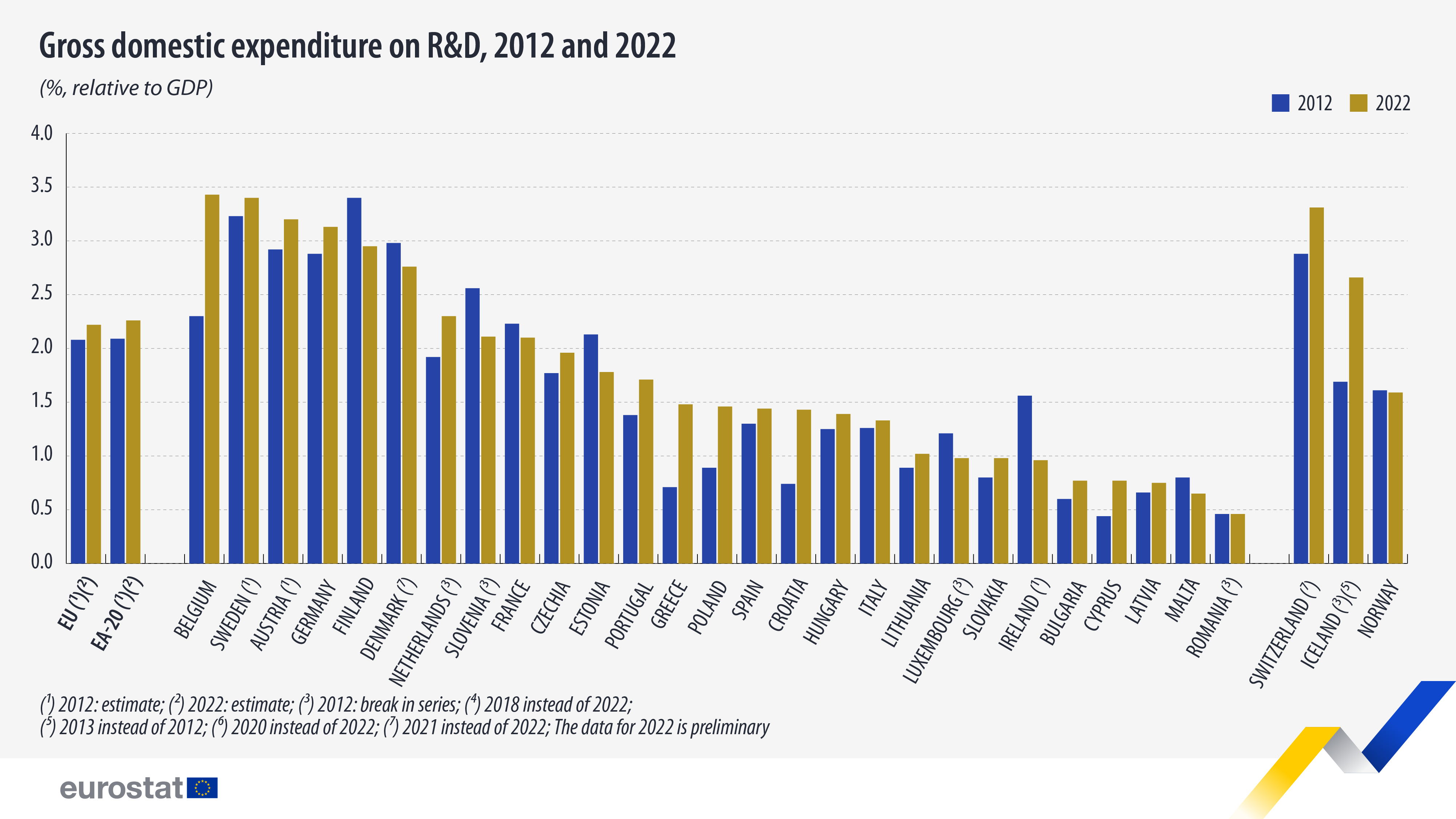 Μεταξύ των μελών της ΕΕ, 4 χώρες κατέγραψαν ένταση Ε&Α πάνω από 3% το 2022. Η υψηλότερη ένταση Ε&Α καταγράφηκε στο Βέλγιο (3,44%), ακολουθούμενη από τη Σουηδία (3,40%), την Αυστρία (3,20%) και τη Γερμανία (3,13%).