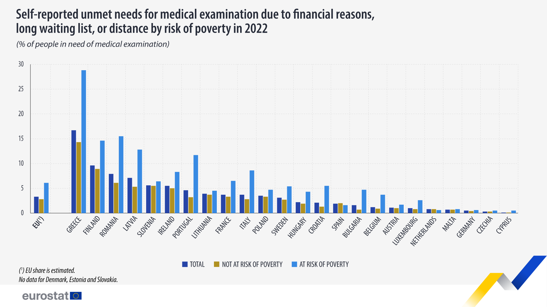 Τα παραπάνω προκύπτουν, μεταξύ άλλων, από σημερινή έκθεση της Eurostat, με θέμα "Ανεκπλήρωτες ανάγκες για ιατρικές εξετάσεις το 2022".