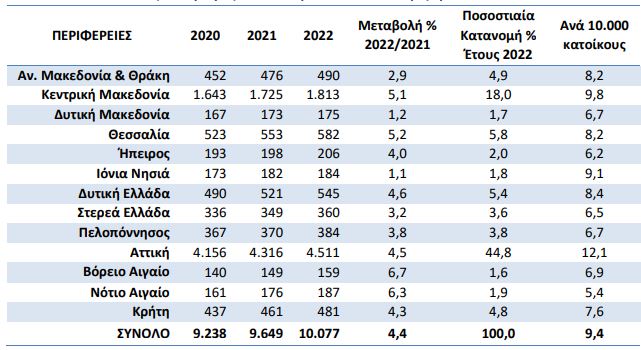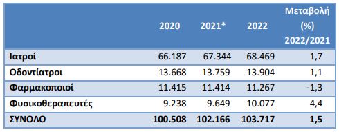 Σύμφωνα με τους συντάκτες της έκθεσης, οι εγγεγραμμένοι επαγγελματίες Υγείας σε σύνολο Χώρας ανήλθαν το 2022 σε 103.717, έναντι 102.166 το 2021.