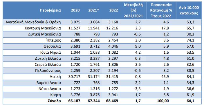 Οι εγγεγραμμένοι ιατροί στους Ιατρικούς Συλλόγους το έτος 2022 ανήλθαν σε 68.469 στο σύνολο της Χώρας, παρουσιάζοντας αύξηση 1,7% σε σχέση με τα στοιχεία έτους 2021.