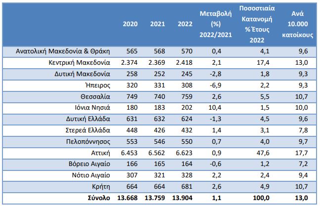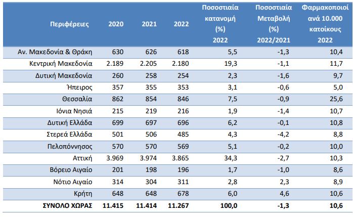 Κατά το έτος 2022 λειτούργησαν 10.552 φαρμακεία στο σύνολο της Χώρας, εκ των οποίων 3.805 (36,1%) στην Περιφέρεια Αττικής.