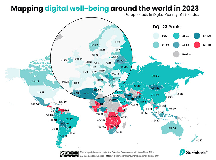 Σύμφωνα με τον Δείκτη Ψηφιακής Ποιότητας Ζωής του SurfShark 2023, ορισμένες χώρες κάνουν καλύτερη δουλειά από άλλες στην παροχή πιο εύκολα προσβάσιμου και προσιτού διαδικτύου και ψηφιακών υπηρεσιών στον πολίτη, οδηγώντας έτσι σε καλύτερη ψηφιακή ευημερία.