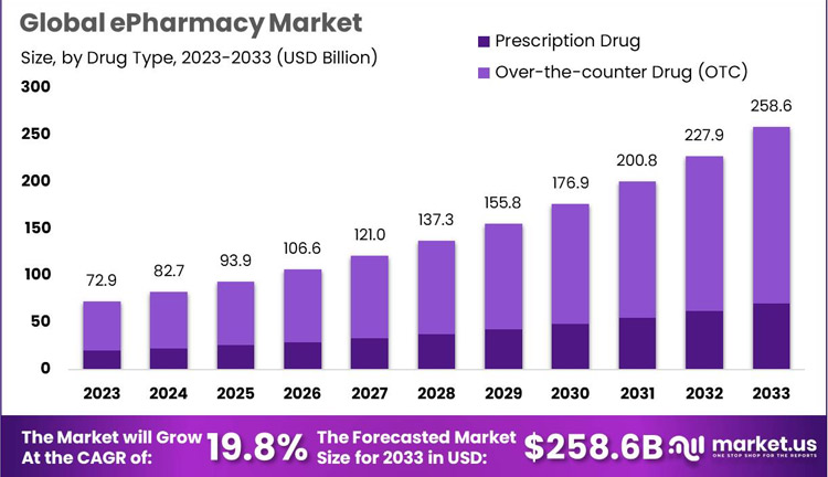 https://www.globenewswire.com/en/news-release/2024/01/03/2803333/0/en/ePharmacy-Market-Poised-for-a-Remarkable-USD-258-6-Billion-Valuation-by-2033-Fueled-by-a-Consistent-19-8-CAGR-Market-us.html