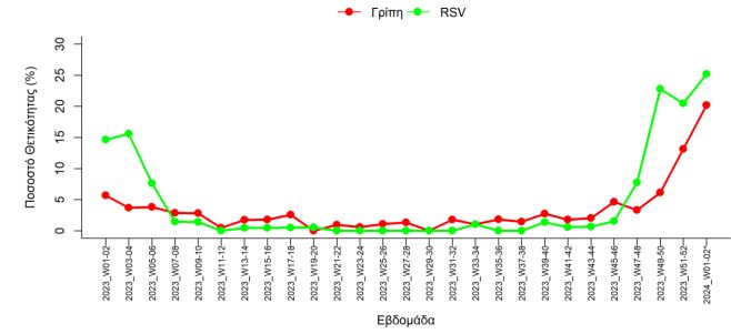 Όπως φαίνεται στο γράφημα που ακολουθεί, η αύξηση στα θετικά δείγματα γρίπης και RSV άρχισε να παρατηρείται στα μέσα Δεκεμβρίου και κορυφώθηκε την πρώτη εβδομάδα του έτους.
