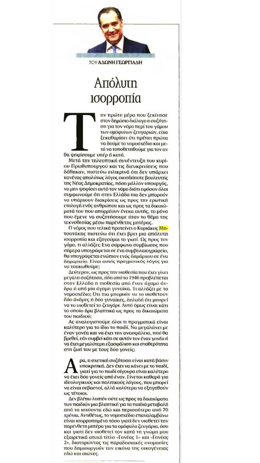 Με άρθρο γνώμης που δημοσιεύεται σήμερα στην εφημερίδα "Τα Νέα", ο Άδωνις Γεωργιάδης αναφέρει χαρακτηριστικά: