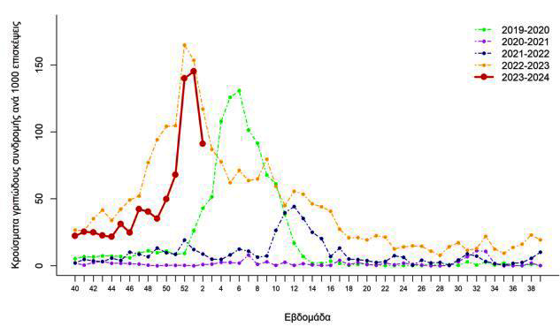 Η δραστηριότητα του αναπνευστικού συγκυτιακού ιού (RSV) άρχισε να αυξάνεται από τα μέσα Οκτωβρίου, φτάνοντας στο μέγιστο στα μέσα Δεκεμβρίου. Ο υψηλότερος αντίκτυπος του RSV συνεχίζει να είναι στα παιδιά έως 4 ετών.