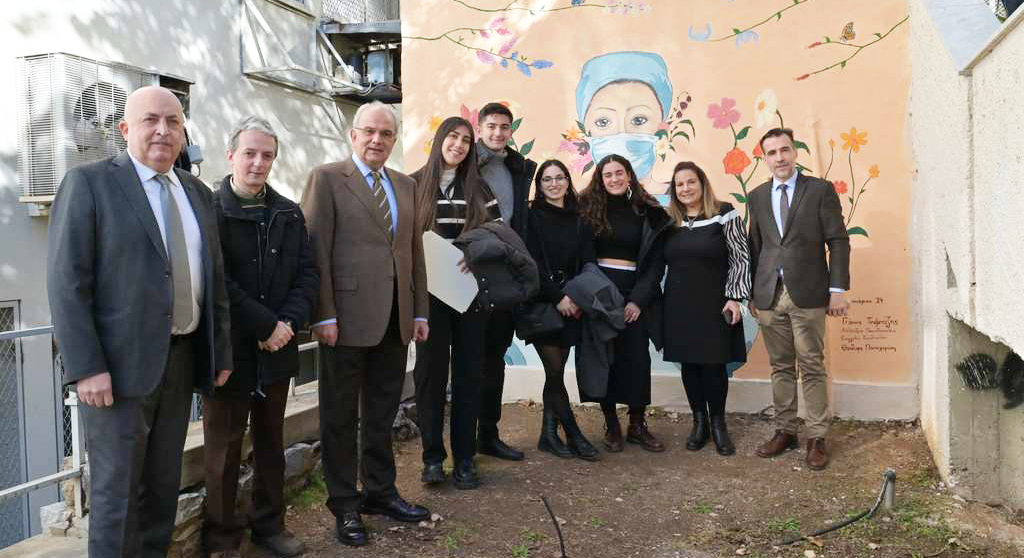 Μια επαγγελματίας υγείας, φορώντας ιατρική ποδιά, μάσκα και γάντια, κρατά στην αγκαλιά της ένα τριαντάφυλλο. Η τοιχογραφία, που κοσμεί τοίχο στο κτίριο διοίκησης του Τμήματος Ιατρικής του ΑΠΘ, φιλοτεχνήθηκε από τις φοιτήτριες του Τμήματος Αλεξάνδρα Παπαδοπούλου, Ευαγγελία Παπαδοπούλου, Θεοδώρα Παπαχαρίση και τον φοιτητή Ιατρικής Γιάννης Τσαμπάζης και ''εγκανιάστηκε'' την ημέρα της κοπής της Βασιλόπιτας της Κοσμητείας.