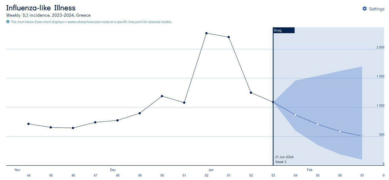 Οι υπεύθυνοι του ECDC προβλέπουν για τη χώρα μας πτωτική τάση στα κρούσματα γριπώδους συνδρομής έως την επόμενη εβδομάδα, όπως προκύπτει από το ακόλουθο γράφημα.