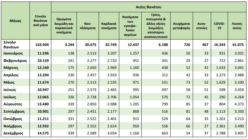 Όπως προκύπτει από τα στοιχεία της έκθεσης και φαίνεται στον πίνακα που ακολουθεί, το 2021 καταγράφηκε ρεκόρ θανάτων 80ετίας (από το 1938).