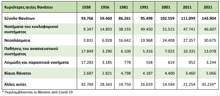 Αντίθετα, οι θάνατοι από λοιμώδη και παρασιτικά νοσήματα από 18,4% των θανάτων το 1938 έχουν περιοριστεί σε ποσοστό 2,3% το 2021.