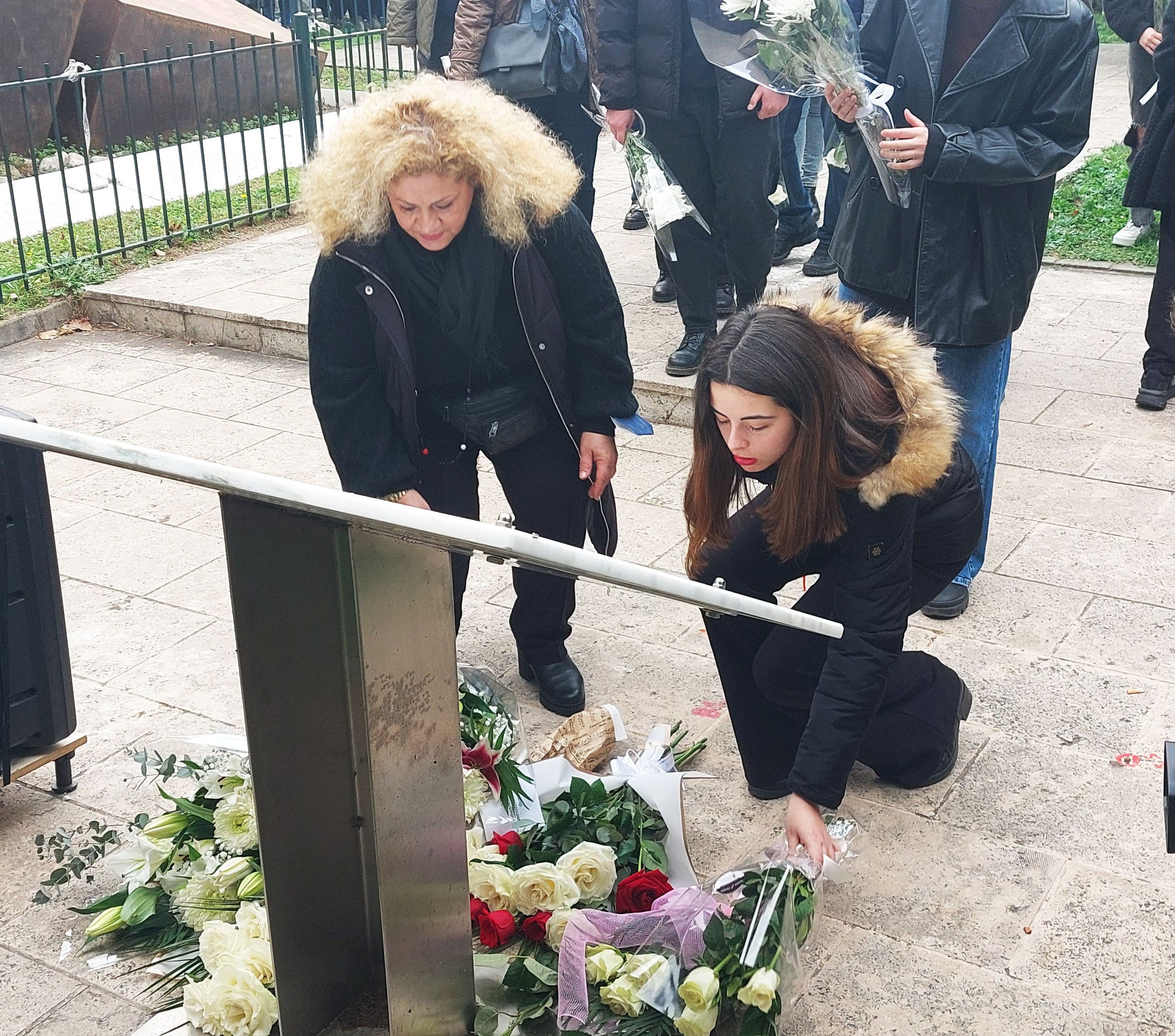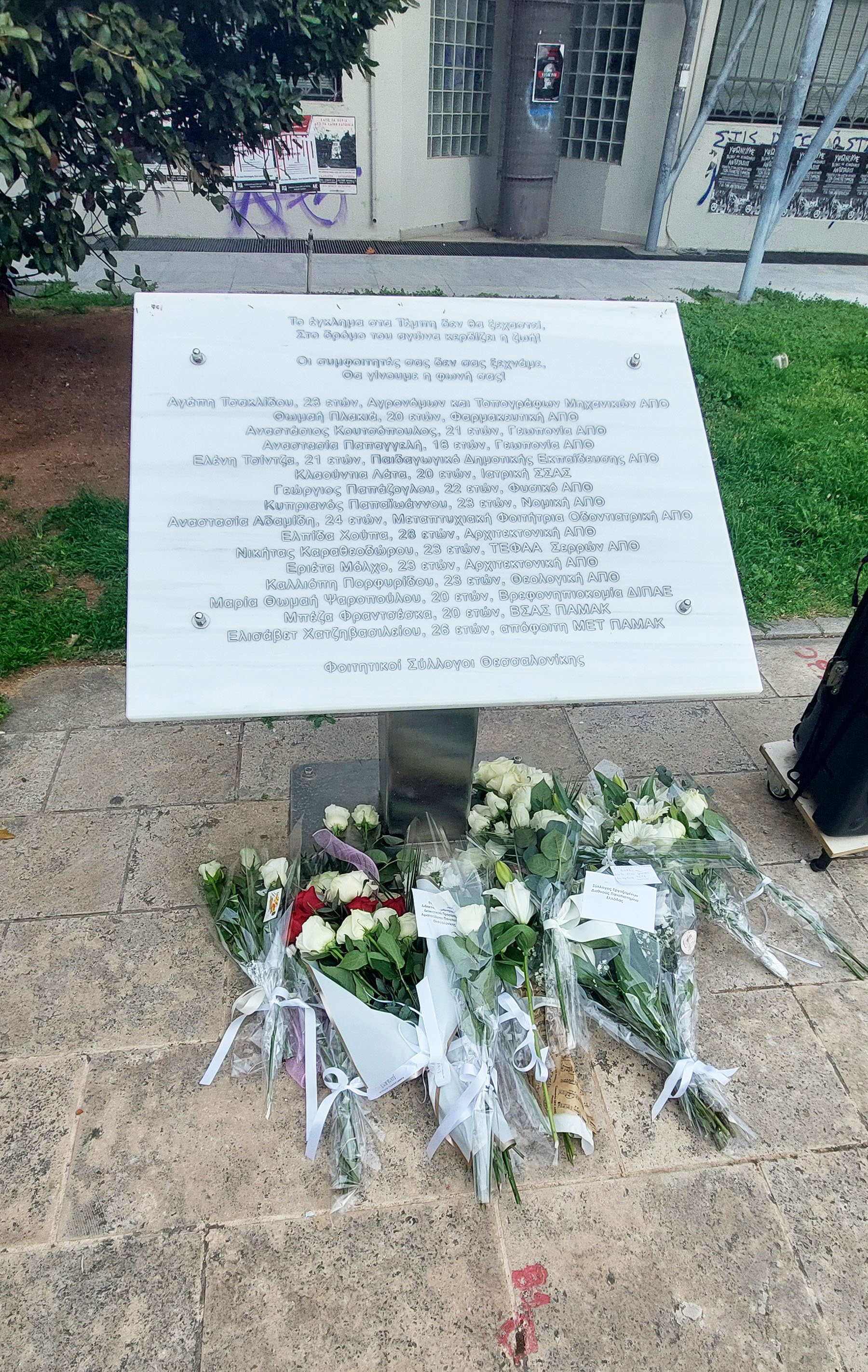Εκατοντάδες συμμετέχοντες στην εκδήλωση μετέβησαν στη συνέχεια στο μνημείο των θυμάτων, έξω από τη Φιλοσοφική Σχολή, όπου κατέθεσαν λουλούδια και την υπόσχεσή τους ότι δεν θα ξεχάσουν.