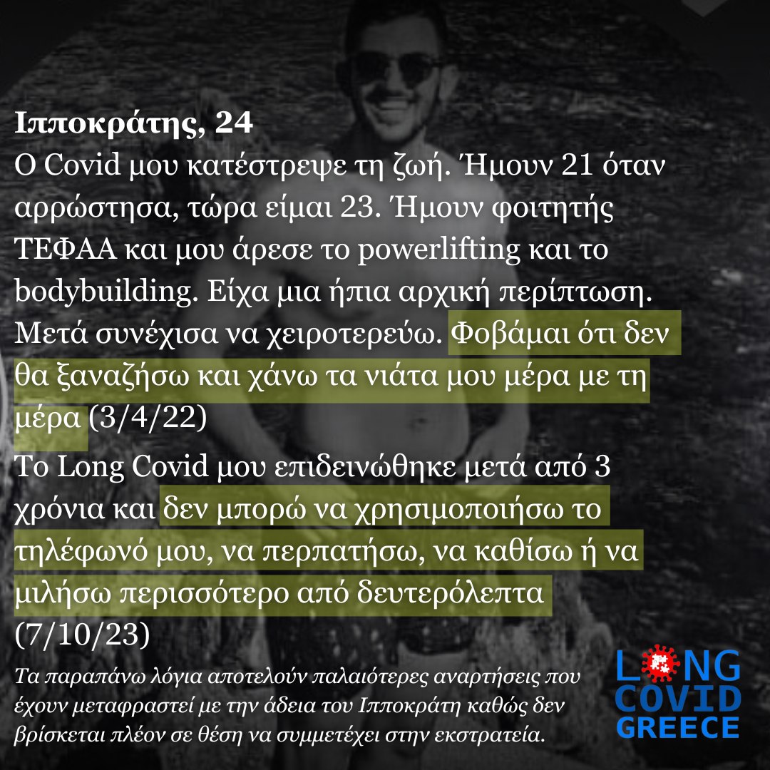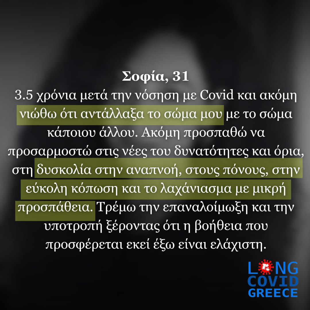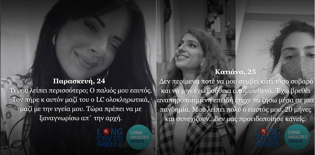 Είναι ορισμένες μόνο από τις δεκάδες μαρτυρίες νέων ανθρώπων που υποφέρουν σιωπηλά από συμπτώματα Long COVID και βιώνουν όπως αναφέρουν μια παράλληλη πανδημία, στο περιθώριο του συστήματος υγειονομικής περίθαλψης, έχοντας χάσει τη λειτουργικότητα, την ενέργεια, την αντοχή και τη δημιουργικότητά τους.