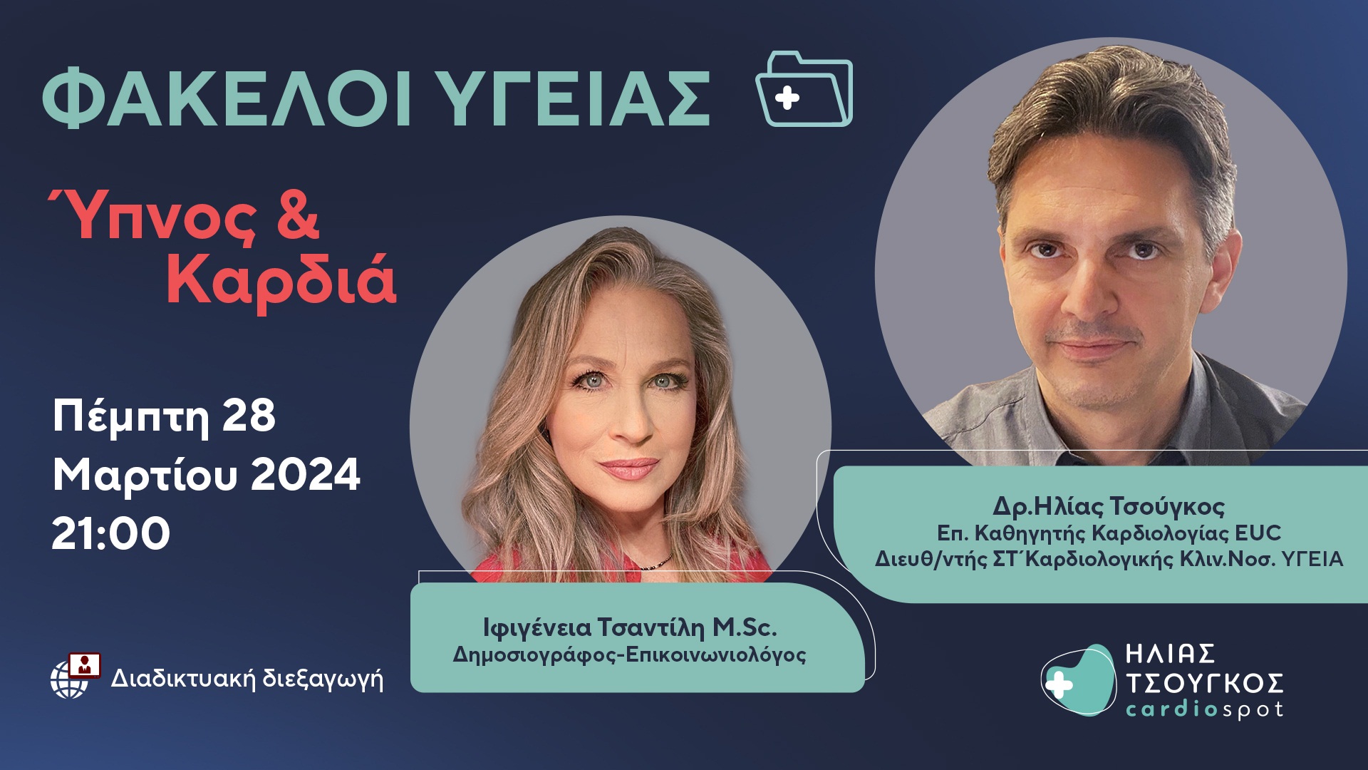 Με αυτό το σκεπτικό, την Πέμπτη 28 Μαρτίου 2024 στις 21:00, ανοίγει ο Φάκελος Υγείας, με ελεύθερη συμμετοχή του κοινού, που έχει θέμα ‘’Ύπνος & Καρδιά’’, στο δεύτερο δωρεάν διαδικτυακό σεμινάριο που διοργανώνει το ΕΛ.Ι.ΚΑΡΔ.ΜΕΤ. για το 2024.