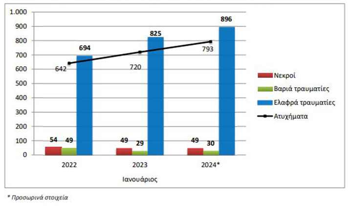 Αύξηση κατά 10,1% σημείωσαν τον Ιανουάριο τα τροχαία ατυχήματα στην Ελλάδα, προκαλώντας 49 θανάτους, 30 βαρείς και 896 ελαφρείς τραυματισμούς.