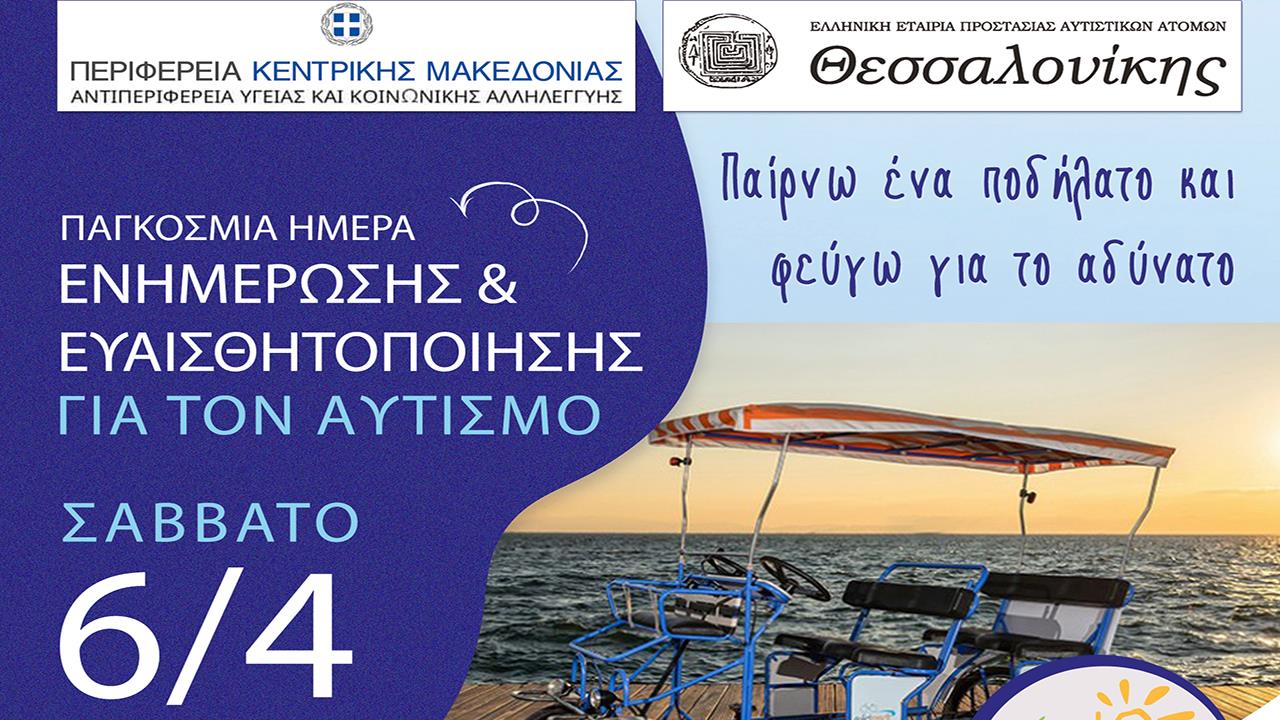 Ειδικότερα, διοργανώνεται για τα παιδιά με αυτισμό και τις οικογένειές τους δωρεάν βόλτα με ποδήλατο με σύνθημα - μήνυμα "παίρνω ένα ποδήλατο και φεύγω για το αδύνατο". Η δράση, που απευθύνεται σε άτομα κάθε ηλικίας τα οποία ενδιαφέρονται να ενημερωθούν για τον αυτισμό, θα πραγματοποιηθεί το Σάββατο 6 Απριλίου, στις 18:00, με σημείο συνάντησης το Μέγαρο Μουσικής Θεσσαλονίκης.