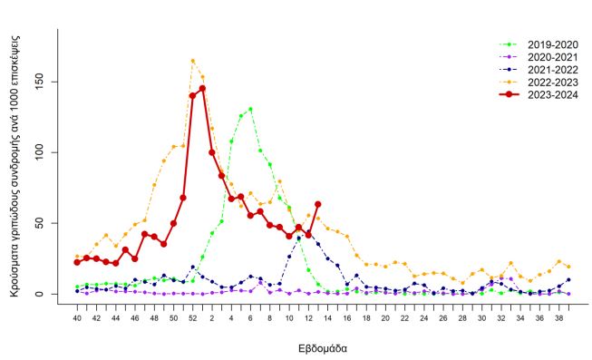Την ίδια ώρα, σημειώνεται αύξηση επισκέψεων σε γιατρούς ασθενών με "γριπώδη συνδρομή", δηλαδή αιφνίδια έναρξη συμπτωμάτων, μεταξύ των οποίων πυρετός, καταβολή, πονοκέφαλος, μυαλγίες, σε συνδυασμό με τουλάχιστον ένα από τα συμπτώματα βήχας, πονόλαιμος, δύσπνοια.