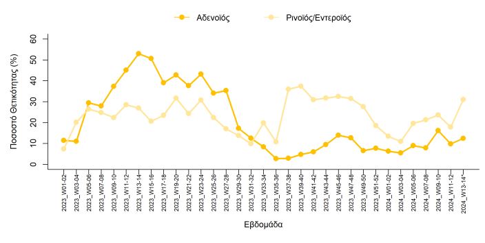 Αισθητή αύξηση καταγράφηκε στη θετικότητα των τεστ για αδενοϊό και ρινοϊό στο δίκτυο των 7 ιδιωτικών κλινικών που παρέχουν στοιχεία στον ΕΟΔΥ: Ιασώ Αθηνών, Ιατρικό Κέντρο Αθηνών, Λευκός Σταυρός Αθηνών, Metropolitan General, Ερρίκος Ντυνάν, Ιασώ Θεσσαλίας και Ιατρικό Διαβαλκανικό Θεσσαλονίκης.