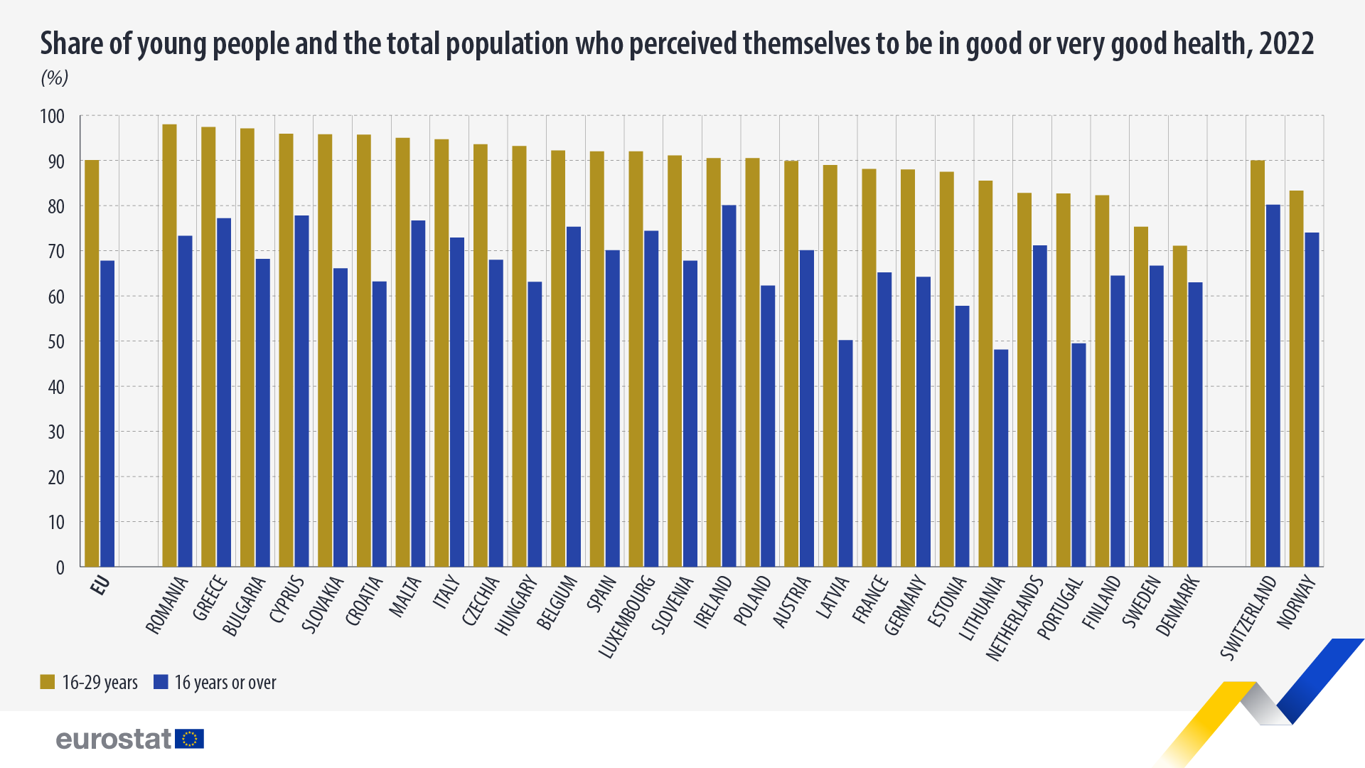 Σύμφωνα με τα στοιχεία του 2022, Ρουμανία, Ελλάδα και Βουλγαρία μοιράζονται τις τρεις υψηλότερες θέσεις στα ποσοστά των νέων 16 έως 29 ετών που δηλώνουν πως έχουν καλή ή πολύ καλή υγεία, με τη Σουηδία και τη Δανία να βρίσκονται στις δύο χειρότερες θέσεις.