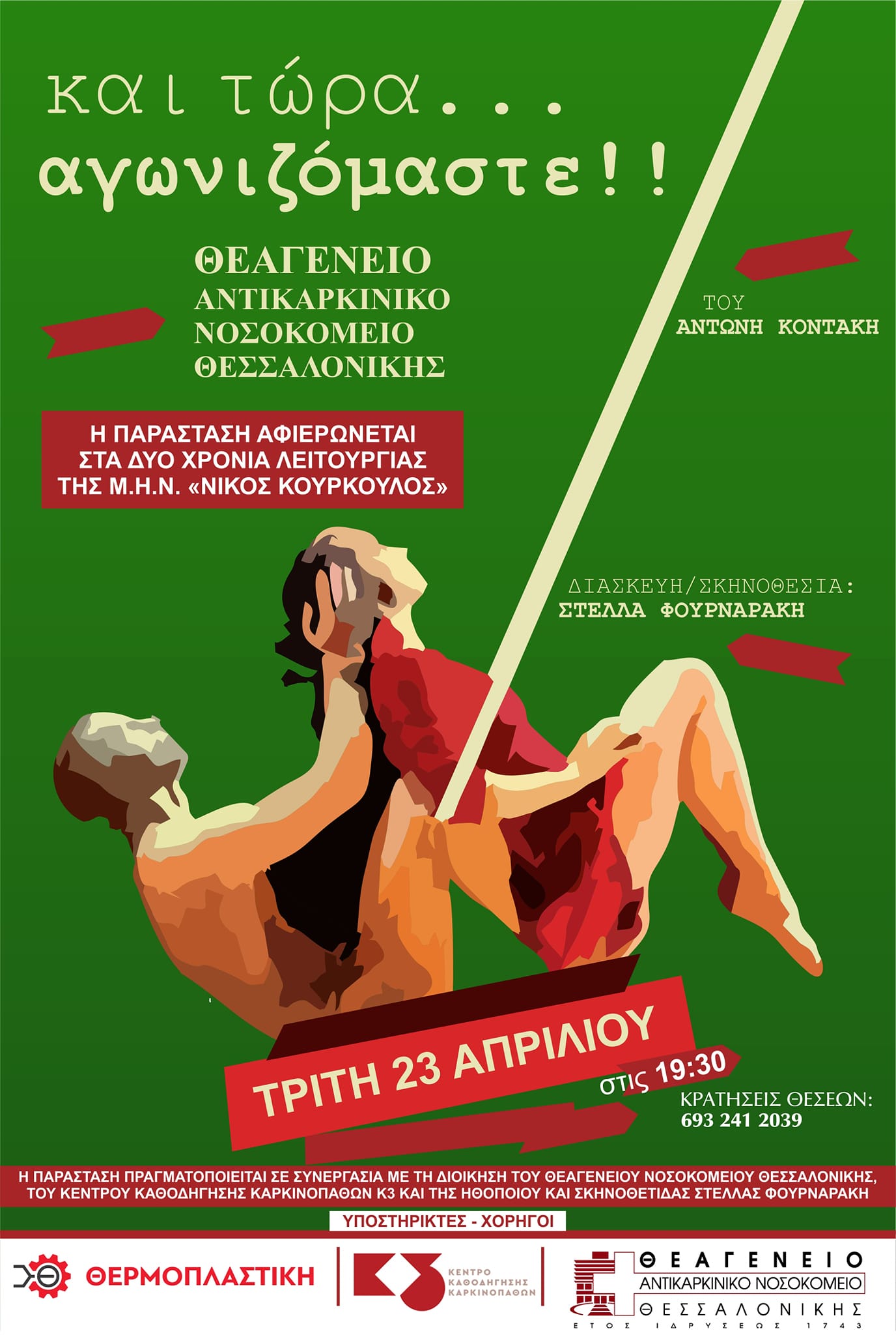 Η θεατρική παράσταση με τίτλο "Και τώρα …Αγωνιζόμαστε!", που παρουσιάστηκε στο αμφιθέατρο του Θεαγένειου αντικαρκινικού νοσοκομείου Θεσσαλονίκης με αφορμή τη συμπλήρωση δύο ετών λειτουργίας της Μονάδας Ημερήσιας Φροντίδας "Νίκος Κούρκουλος", περιγράφει με βιωματικό τρόπο το ταξίδι στο άγνωστο μιας ασθενούς από το σοκ της διάγνωσης μέχρι τη θεραπεία. Παράλληλα, εκπέμπει πολλαπλά μηνύματα για την εσωτερική δύναμη που ανακαλύπτει κανείς στα δύσκολα, την αλληλεγγύη που εισπράττει από γνωστούς και συμπάσχοντες, την αλλαγή οπτικής για τη ζωή που συνεπάγεται ο αγώνας με την ασθένεια.