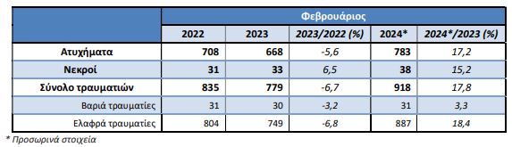 Τα παραπάνω προκύπτουν από σημερινή έκθεση της ΕΛΣΤΑΤ, με θέμα "Οδικά τροχαία ατυχήματα, Φεβρουάριος 2024).