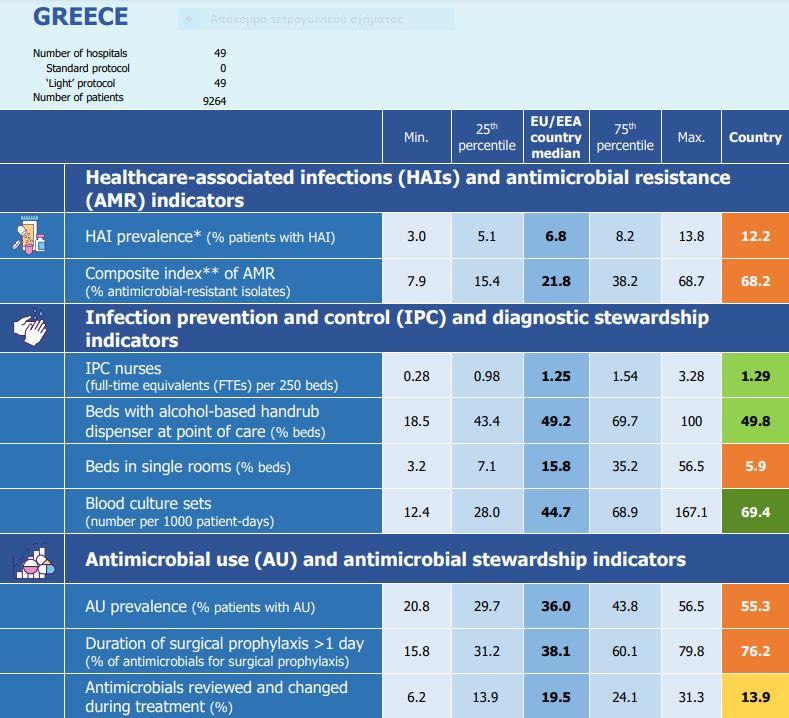 Τα στοιχεία του ECDC δείχνουν πως η Ελλάδα έχει πολύ χειρότερη εικόνα από τον μέσο ευρωπαϊκό όρο. Όπως φαίνεται στον πίνακα που ακολουθεί, έχει διπλάσιο ποσοστό ασθενών με ενδονοσοκομειακή λοίμωξη (12,2% ή ένας στους οκτώ ασθενείς), έναντι μόλις 6,8% στην Ευρώπη, υποδιπλάσια μονά δωμάτια νοσηλείας (5,9%, έναντι 15,8%), πολύ υψηλότερη χορήγηση αντιβιοτικών (55,3%, έναντι 36%) και διπλάσια χρήση αντιβιοτικών για πάνω από μία μέρα νοσηλείας (76,2%, έναντι 38,1%).