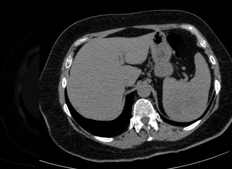 Η ασθενής δεν είχε σημαντικό ιατρικό ιστορικό και οι εργαστηριακές εξετάσεις της ήταν κανονικές. Η αξονική τομογραφία κοιλίας αποκάλυψε, ωστόσο, μία μεγάλη μάζα στον σπλήνα. Πραγματοποιήθηκε σπληνεκτομή και η ιστοπαθολογική ανάλυση αποκάλυψε φλεγμονώδη μυοϊνοβλαστικό όγκο.