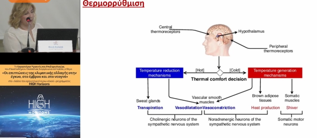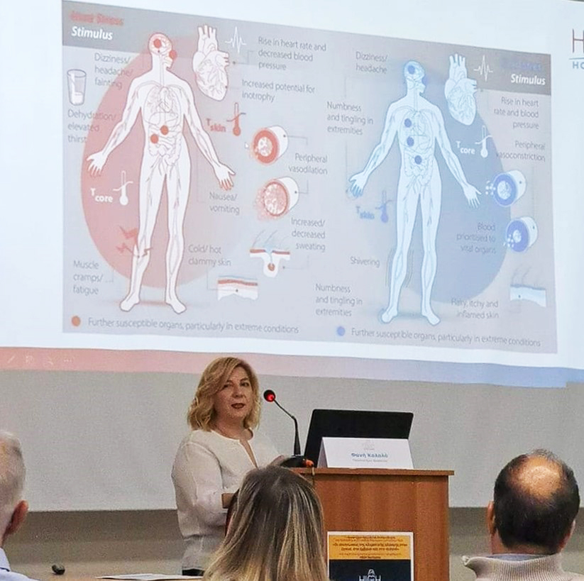 Τι γίνεται όμως όταν το ερέθισμα, δηλαδή η αύξηση της θερμοκρασίας, είναι συνεχές και για διάφορους λόγους δεν μπορούμε να αντιρροπήσουμε την αύξηση της θερμοκρασίας; Η κ. Φανή Καλαλά (φωτογραφία), επίκουρη καθηγήτρια στο Εργαστήριο Ανοσολογίας του Πανεπιστημίου Θεσσαλίας, μίλησε για τους μηχανισμούς απάντησης του ανθρώπινου οργανισμού, για τα όργανα και συστήματα που είναι πιο ευάλωτα στην αύξηση της θερμοκρασίας και για τις πιθανές βλάβες που μπορεί να προκληθούν, στο πλαίσιο επιστημονικής εκδήλωσης που διοργάνωσε πρόσφατα στη Λάρισα το Εργαστήριο Υγιεινής και Επιδημιολογίας του Πανεπιστημίου Θεσσαλίας για την παρουσίαση του έργου High Horizons.