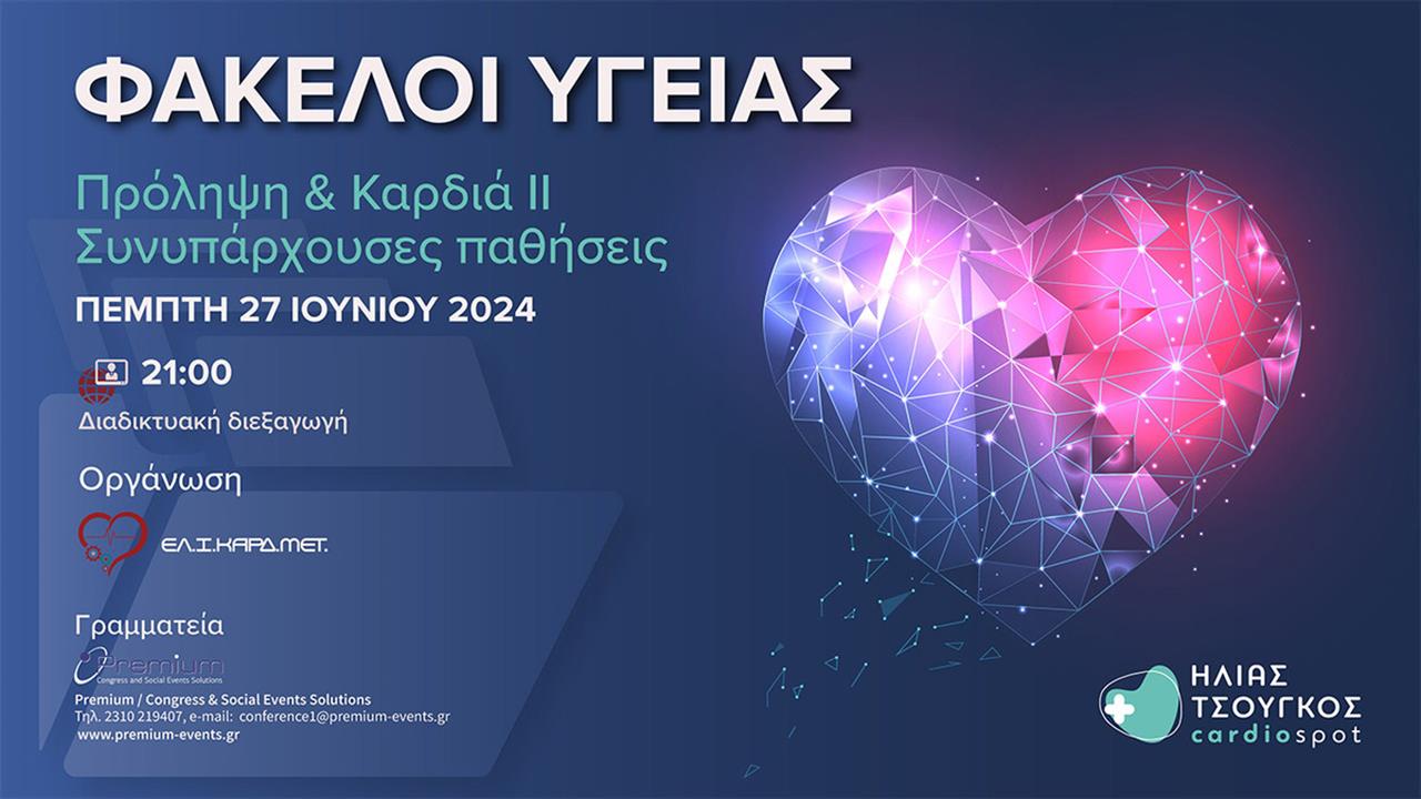 Με ένα σημαντικό θέμα θα ανοίξει ο 5ος φάκελος υγείας του ΕΛ.Ι.ΚΑΡΔ.ΜΕΤ για το 2024 με θέμα «Πρόληψη & Καρδιά ΙΙ: Συνυπάρχουσες παθήσεις», την Πέμπτη 27 Ιουνίου και ώρα 21:00.