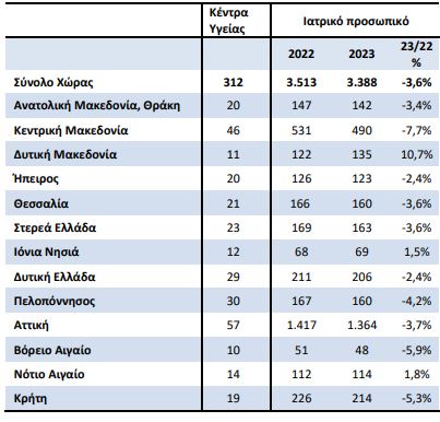 Ο αριθμός του ιατρικού προσωπικού που απασχολείται στα Κέντρα Υγείας παρουσίασε μείωση κατά 3,6% το 2023 σε σχέση με το 2022, στο σύνολο της Χώρας.
