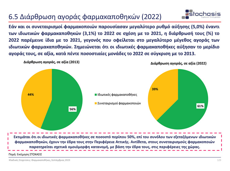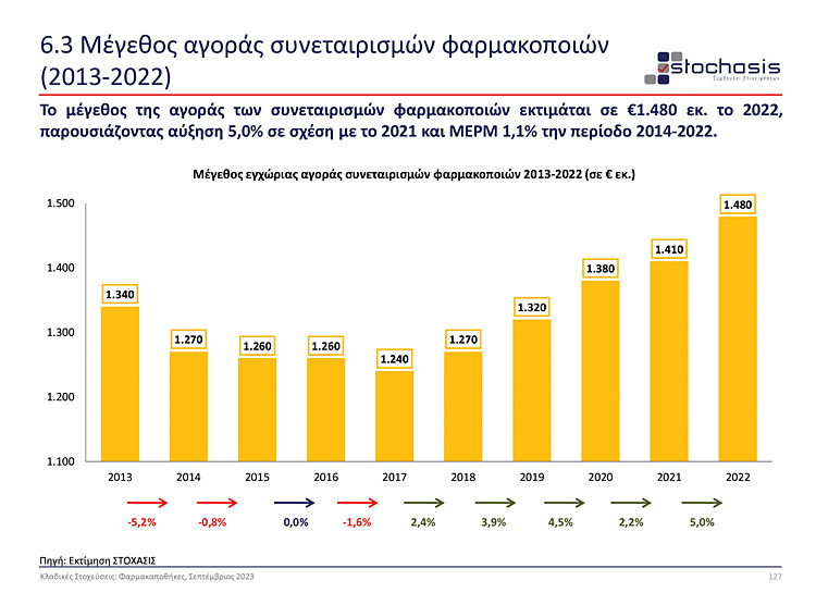 3) Οσον αφορά στο μέγεθος αγοράς των Συνεταιρισμών Φαρμακοποιών εκτιμάται σε 1.480 εκατ. Ευρώ το 2022 από 1.410 το 2021, άνοδο 5% και Μέσο Ετήσιο Ρυθμό Μεταβολής 1,1% την περίοδο 2014-2022. Σημειώνεται ότι το 2013 το μέγεθος των Συνεταιρισμών Φαρμακοποιών ήταν 1.340 εκατ. ευρώ.