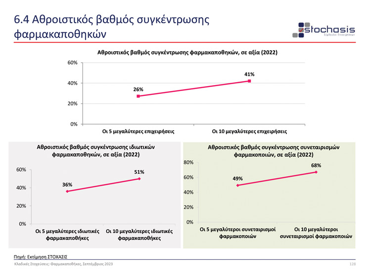 Ειδικότερα στις Ιδιωτικές φαρμακαποθήκες τα σχετικά ποσοστά διαμορφώνονται ως εξής : 36% (Οι 5 πιο δυνατοί παίκτες) και 51% (οι 10 μεγαλύτερες εταιρείες). Στους Συνεταιρισμούς από την άλλη, τα αντίστοιχα ποσοστά διαμορφώνονται 49% (5 μεγαλύτεροι Συνεταιρισμοί) και 68% (10 μεγαλύτεροι Συνεταιρισμοί).