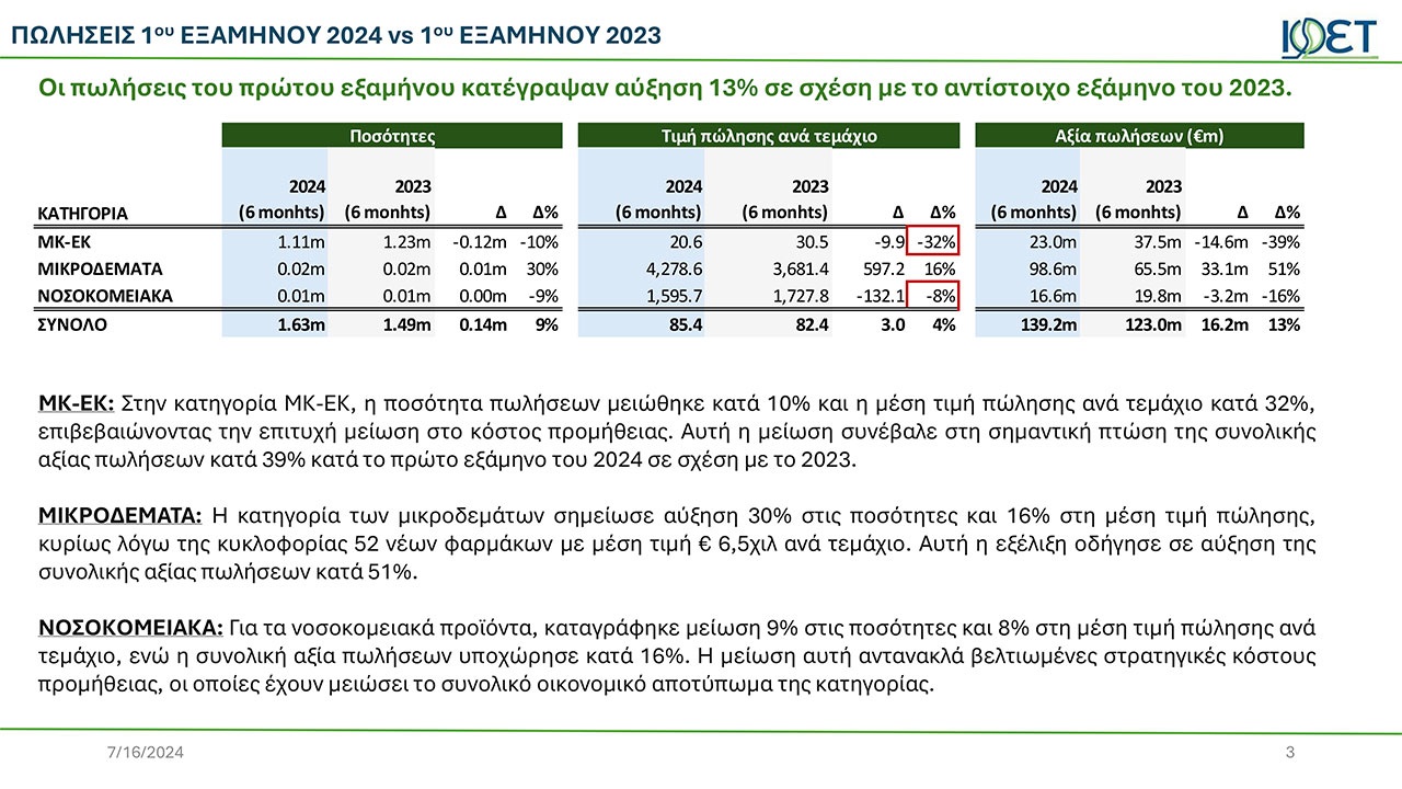 ΜΚ-ΕΚ: Στην κατηγορία ΜΚ-ΕΚ, η ποσότητα πωλήσεων μειώθηκε κατά 10% και η μέση τιμή πώλησης ανά τεμάχιο κατά 32%, επιβεβαιώνοντας την επιτυχή μείωση στο κόστος προμήθειας. Αυτή η μείωση συνέβαλε στη σημαντική πτώση της συνολικής αξίας πωλήσεων κατά 39% κατά το πρώτο εξάμηνο του 2024 σε σχέση με το 2023.