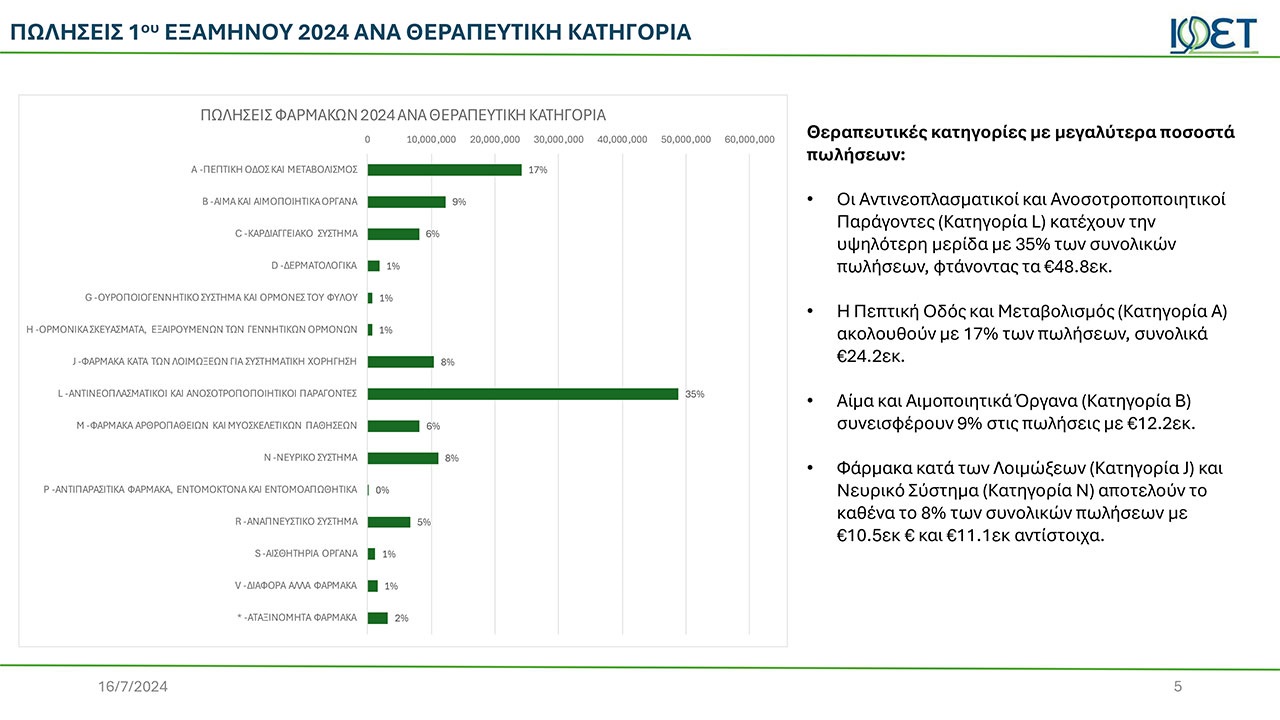 Οι Αντινεοπλασματικοί και Ανοσοτροποποιητικοί Παράγοντες (Κατηγορία L) κατέχουν την υψηλότερη μερίδα με 35% των συνολικών πωλήσεων, φτάνοντας τα 48.8εκατ. ευρώ