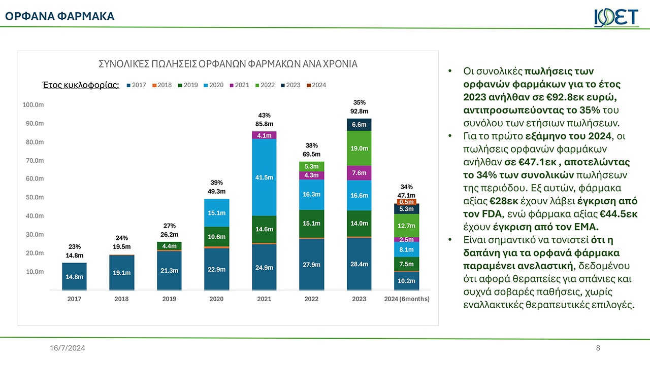 Οι συνολικές πωλήσεις των ορφανών φαρμάκων για το έτος 2023 ανήλθαν σε 92.8εκατ. ευρώ, αντιπροσωπεύοντας το 35% του συνόλου των ετήσιων πωλήσεων.